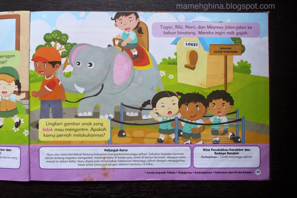 Satu halaman menggambarkan suatu aktivitas. Misalnya gambar di bawah ini cerita Togar, Riki, Noni dan Meymey jalan-jalan ke kebun binatang. Mereka ingin naik gajah. Saat Noni sedang naik gajah, Meymey dan Riki mengantri nunggu giliran naik gajah. Tiba-tiba Togar menyerobot antrian dan membuat Meymey dan Riki kesal. Ada tulisan keterangan dalam gambar tersebut, "Lingkari gambar anak yang tidak mau mengantre. Apakah kamu pernah melakukannya?" (Rangsang anak menjawab pertanyaan dalam setiap cerita, dengarkan pendapatnya dan koreksi bila ia keliru.
